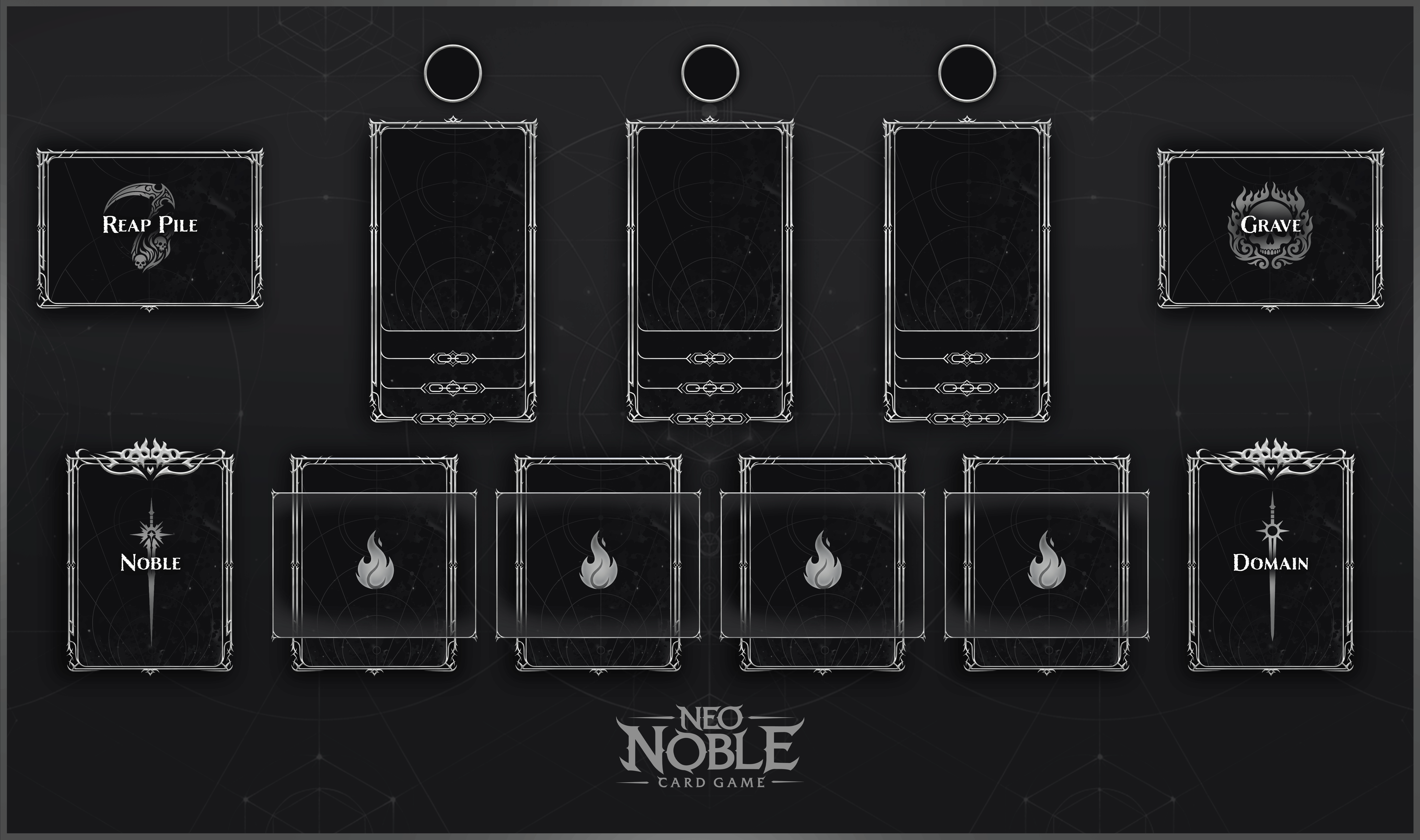 Neo Noble's gameboard (a.k.a. playmat or play area) consists of seven main zones. These zones determine how a player manages resources, summons cards, battles, and tracks their victory points.